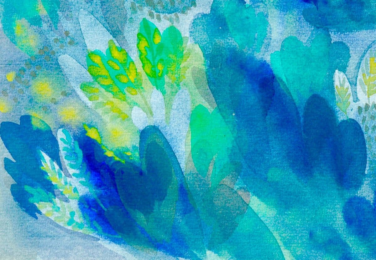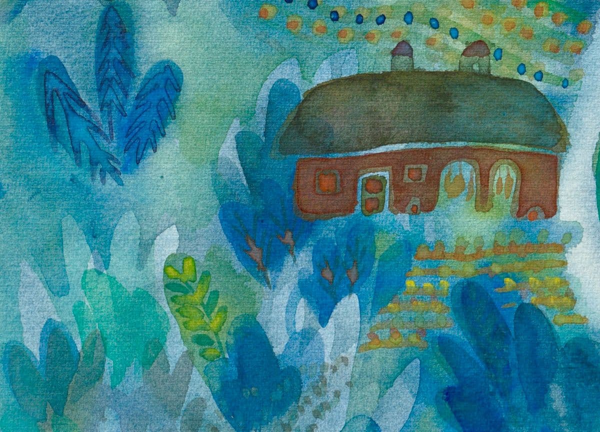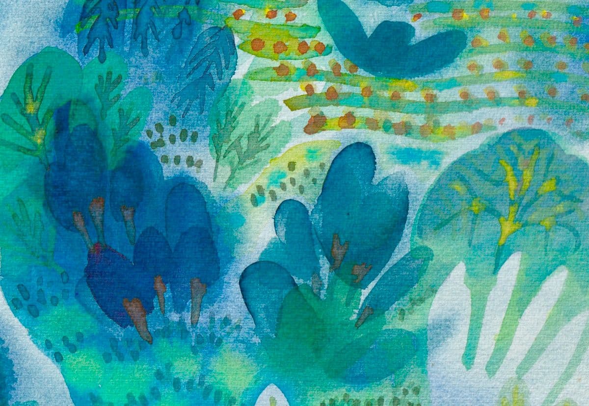 Watercolor cycle on the theme of the garden. Green fronds set in fairy-tale images.